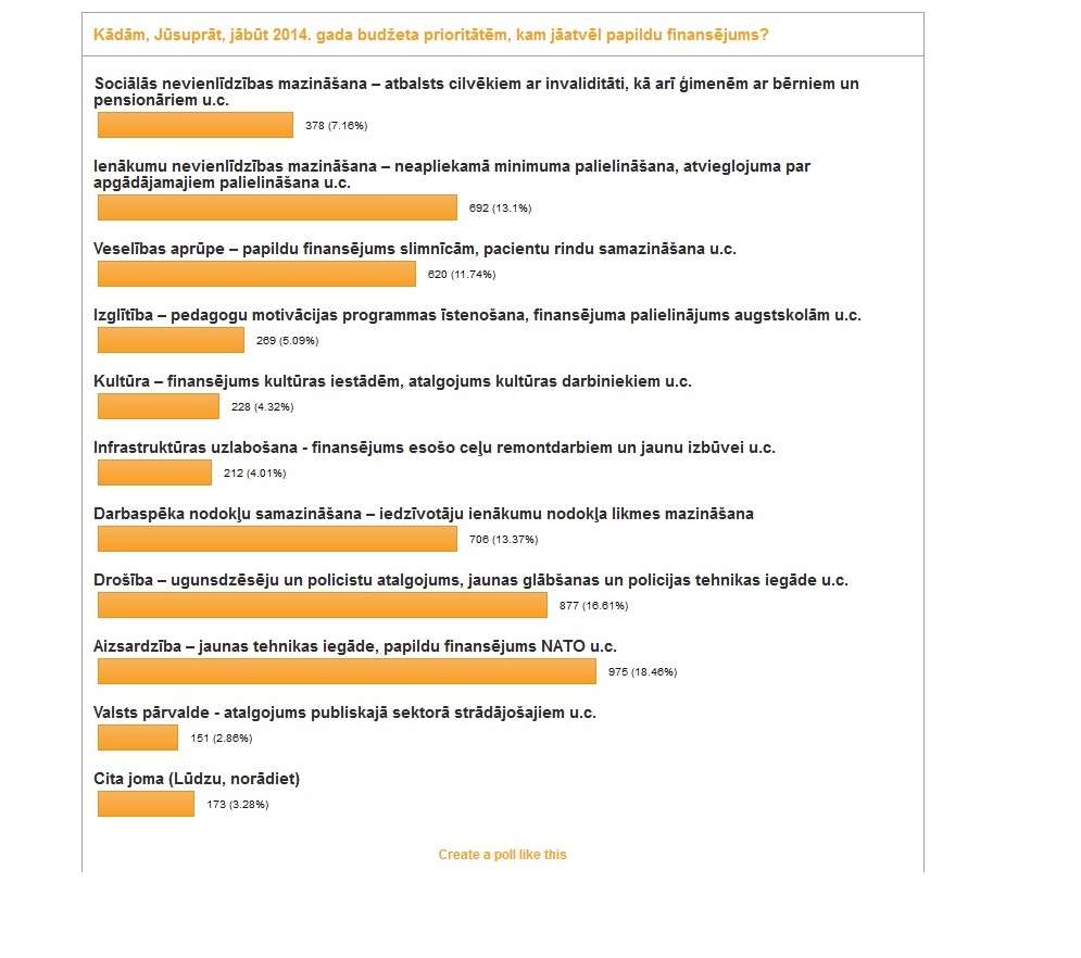 Šā gada 30. jūlijā valdība sāks darbu pie 2014. gada valsts budžeta izskatīšanas. Līdz tam Finanšu ministrija (FM) sadarbībā ar Pārresoru koordinācijas centru ir apkopojusi visu nozaru ministriju jaunās politikas iniciatīvas nākamajam gadam, secinot, ka kopējā pieprasījuma summa ir virs 550 miljoniem latu. Indikatīvas fiskālas iespējas, ko varētu papildus piešķirt nozaru ministriju tēriņiem, ir 50 miljoni latu. Tāpēc FM aicina iedzīvotājus līdz šā gada 29. jūlijam piedalīties aptaujā un atzīmēt tās prioritātes, kurām, viņuprāt, būtu jāatvēl pieejamais finansējums. Aptauja ir pieejama šeit.