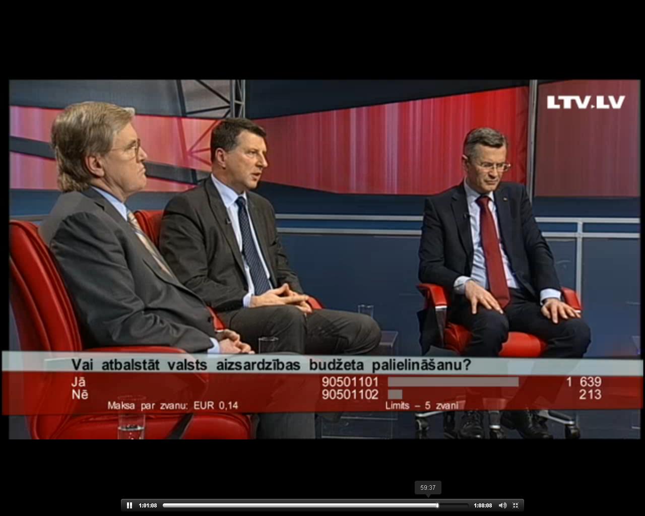 1. Man pret Vējoni radās zināms respekts. Nezinu vai tas ir vēlēšanu tuvums, bet dažas replikas bija izcilas, piemēram, lai nelasa vecus laikrakstus, bet paskatās internetā pēdējos datus runājot par to cik valstu nodrošina 2% aizsardzībai.