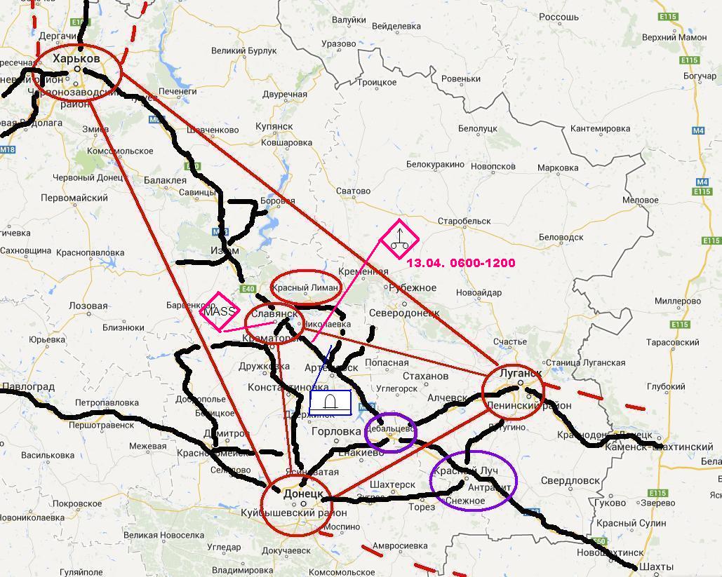 1. Pagaidām izskatās, ka Slavjanska ir daļa no kaujas plāna. Šeit rīkojās pēdējām dienām neraksturīgi..formas – tomēr mācās no kļūdām, ekipējums, bruņojums), bez protestiem – pūļa aizsega.. enerģiski, agresīvi, izlēmīgi. Iespējams, tiek mēģināts ieņemt labākas pozīcijas pirms 17. datuma četru pušu sarunām, lai būtu par ko tirgoties. Vai arī jau izlemt šo jautājumu pirms šīm sarunām.