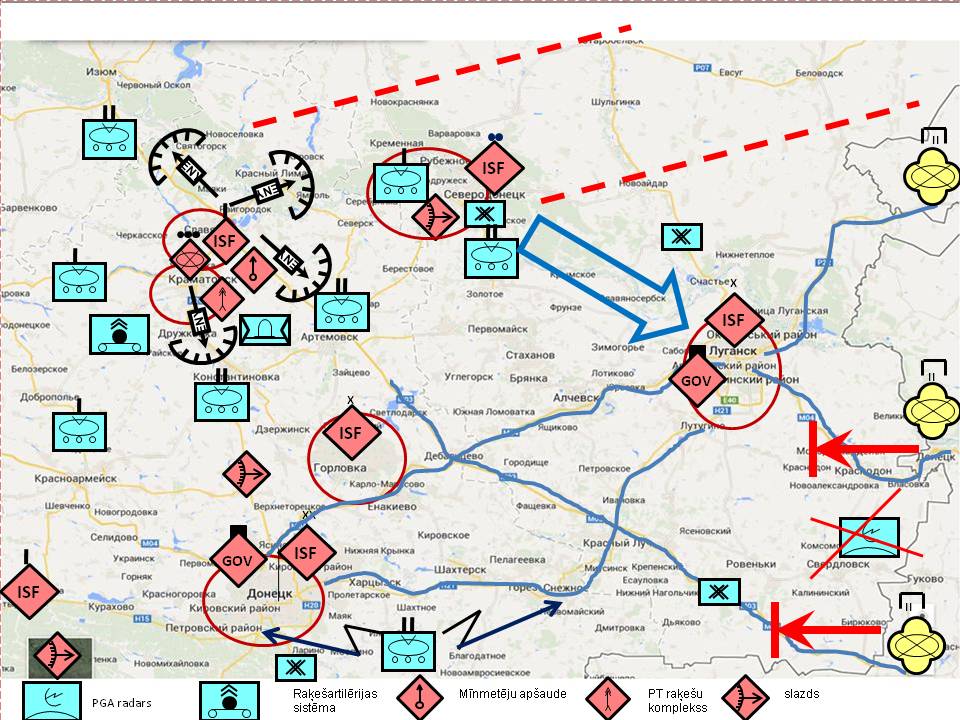 22.maijā Aktivizējusies kaujas darbība uz A, ZA no Slavjanskas un DR no Doņeckas, kur līdz šim saglabājās  samērā stabila situācija. Severodoņeckas, Rubežnoje, Volnovahas  apkārtnē notiek sadursmes ar separātistiem, blokposteņu apšaudes un uzbrukumi UA BS konvojiem no slazdiem. Agrāk separātistu pārstāvji izteicās par nepieciešamību nodibināt apgādes “koridoru” ar RU (piemērs). ņemot vērā autoceļu tīkla izvietojumu visizdevīgakāis virziens koridora izveidošanai ir Krasnij Ļiman – Rubežnoje – Starobeļsk – Belovodsk – Melovoje. Vienlaikus bruņotas grupas cenšas iekļūt UA no RU teritorijas. Var prognozēt, ka tuvākajās dienās kaujas darbības intensitāte uz A no Slavjanskas pieaugs un kulmināciju sasniegs 25.maijā, kad UA ir plānotas prezidenta vēlēšanas. Separātistu uzdevums ir radīt augstus teroristisko uzbrukumu draudus un tā padarīt balsošanas procesu neiespējamu vismaz divos UA apgabalos, kas ļaus apšaubīt vēlēšanu iznākumu kopumā. Savukārt UA BS centīsies nepieļaut bruņoto grupu infiltrēšanos caur valsts “zaļo” robežu un sasaistīt ar kaujām aktīvākās separātistu grupas.