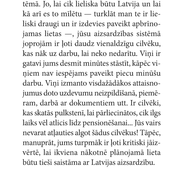Visā intervijā un, jo īpaši pēdējā lappusē, varēja just to vēstījumu – sāciet beidzot strādāt un nodarboties ar īstajām, vajadzīgajām lietām!