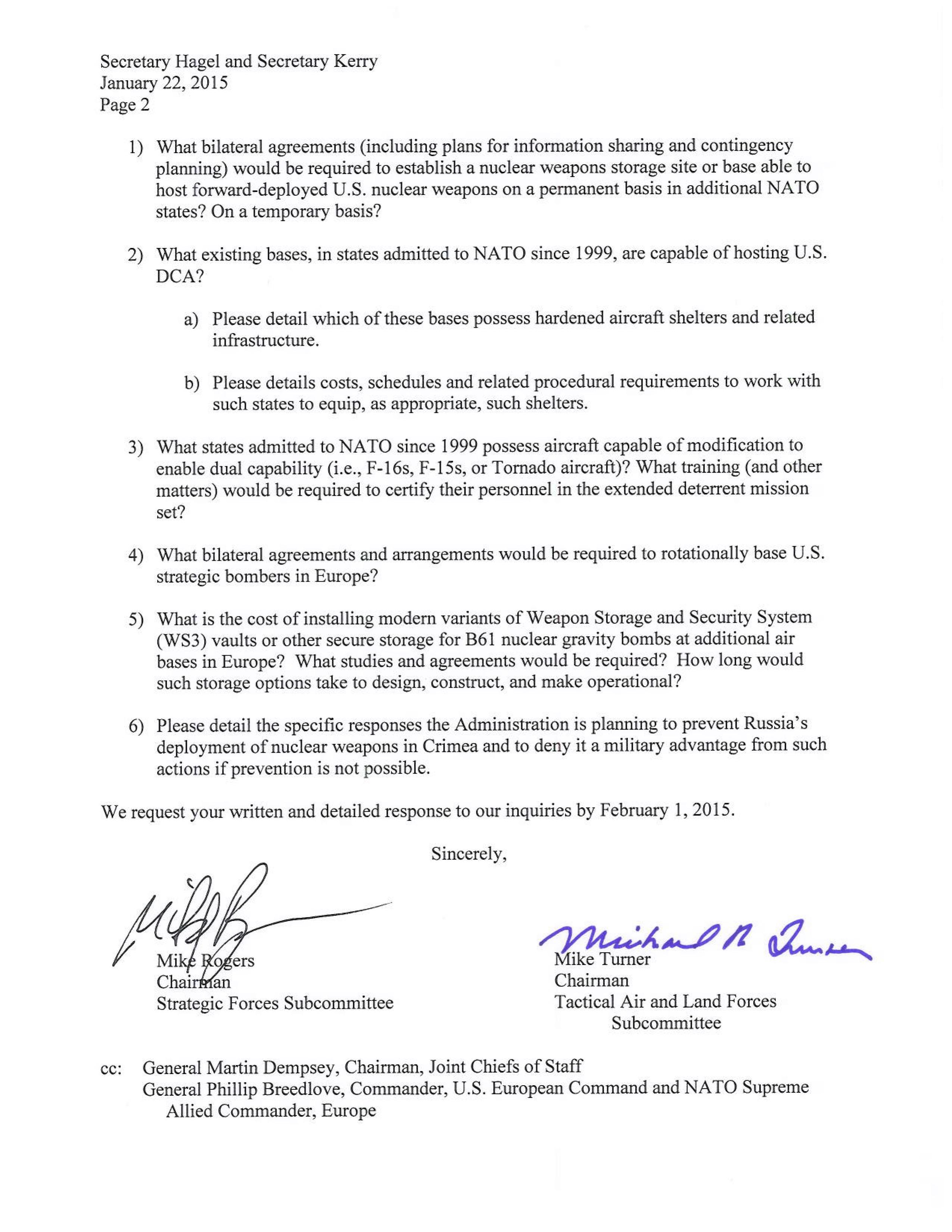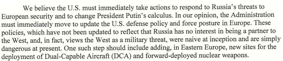 vara bungas: vēstule tika nosūtīta ASV aizsardzības ministram un Valsts sekretāram 22.janvārī,  pirms Mariupoles traģēdijas, to parakstīja ASV Pārstāvju palātas divu aizsardzības apakškomiteju vadītāji, tātad šoreiz nevar būt PR akcija vai populisms. Visticamāk, ka tūlītēja rīcība no ASV prezidenta nesekos, bet šādas vēstules veido fonu, kas iespaido drošības stāvokli A-Eiropā. Ja Obamas administrācija nedarīs neko (visticamāk) un aprobežosies ar “zibenīgas reaģēšanas” (c) ofisu dibināšanu Baltijas valstīs, var gadīties, ka ar to bus gana, pie nosacījuma, ka RU ekonomiskais stāvoklis pasliktinās straujāk nekā aug Pu ambīcijas. Ja tomēr Obamas administrācija izdarīs (maz ticams) kaut mazāko daļu no tā,  ko vēstulē  prasa kongresmeņi,  RU aizies “ballistic”, t.i., sacels globālo haju par kodolapdraudējumu  un  atkal solīs “samalt Amēriku radioaktīvos pīšļos” tikai tagad tas skanēs no  augstāka varas līmeņa. Jebkurā gadījumā pasaule un LV no tā visa drošāka nepaliks. Tas, kas mums tiešām būtu vajadzīgs ir reģionālas konvencionālā bruņojuma glabāšanas noliktavas “pa rokai” ar ko vajadzības gadījumā varētu apbruņot brīvprātīgos.  Tas arī izraisīs nopietnu pretreakciju, bet saglabās cerību, ka lielvalstis nesāks karu ar visjaudīgākiem MII ieročiem.