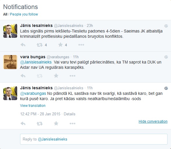 • Paldies. Kā būtu tieši ar UA konflikta klasificēšanu, kas de jure jau ir atzīts par ATO? Ženēvas (1949) konvencijas 2 un 3 pantā nostiprināti starptautiskā bruņotā konflikta un iekšējā bruņotā konflikta jēdzieni, kas mūsu KL panta redakcijā nav atdalīti, lai gan brīvprātīgo ārzemnieku dalība karā pret ārējo agresoru nav tas pats, kas dalība pilsoņu karā. Tomēr NA vadītās TM (vai nav dīvaini) sagatavotie KL grozījumi kriminalizē to par ko mēs līdz šai dienai esam pateicīgi tiem EE un LT pilsoņiem, kas kopā ar latviešiem cīnījās nacionālo partizānu rindās.