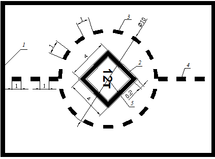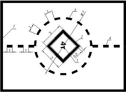 (размеры в метрах): 1 – граница рабочей площади; 2 – опознавательный знак; 3 – знак ограничения участка приземления при посадке по-вертолетному; 4 – осевая линия; 5 – цифра ограничения веса.