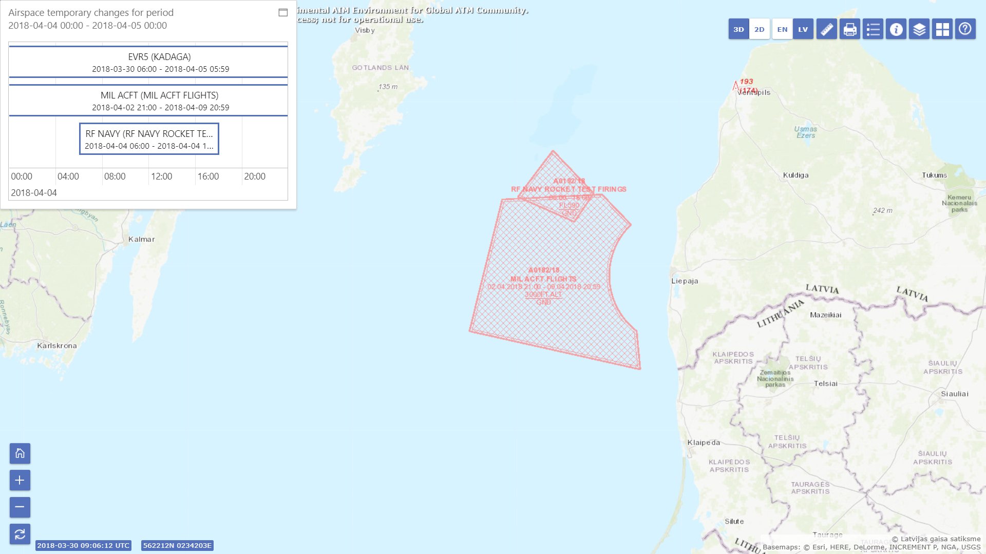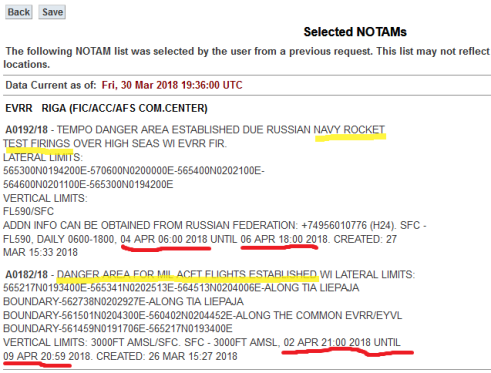 Krievijas Jūras spēki laika posmā no 4. aprīļa līdz 6. aprīlim no pulksten 6 līdz 18 gaisa telpā virs Latvijas ekskluzīvās ekonomiskās zonas Baltijas jūrā plāno veikt raķešu šaušanas pārbaudi. [..]