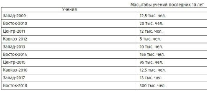 Kā redzams no tabulas visas pēdējo gadu RU mācības iesaistītā personāla ziņā reāli tuvinās Jom-Kippur kara laika (bruņota konflikta)   mērogam , bet propagandas līmenī   RU cenšas demonstrēt spējas, kas apmēram līdzinātos 2003.gada Irākas kara (reģionāls karš) mērogam. Līdz ar to RU gatavojas un demonstrē pierādītu spēju veikt operācijas no robežkonflikta (-iem) līdz  bruņotam konfliktam, bet vēlas, lai straptautiskā sabiedrība notic RU spējai panest reģionālu karu , ar nosacījumu, ka ,  jo tālāk  no RU robežām, jo mazāka mēroga spēkus RU spēj projecēt. RU eksperti redz to šādi: