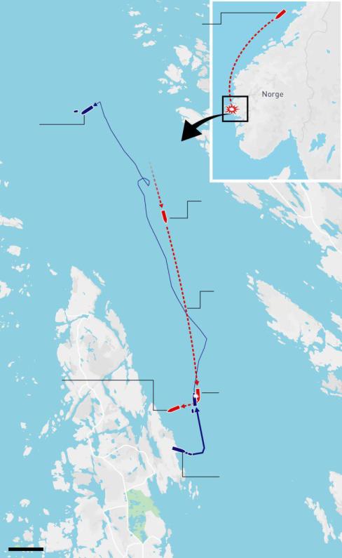 The pumps could not cope with the water ingress. 10 tons fuel leaked into the water. Seven persons suffered slight injuries. The fregate had a crew of 137 on board. 127 were initially taken off with life rafts. At 6.30 a.m. the commander decided that also the remaining 10 had to abandon ship. All were taken to the Sure Terminal. The lifeboat “Kristian Gerhard Jebsen II” was involved in the rescue mission. Only the commander of the frigate went aboard the “Sjøbrand”, a boat of the Bergen Fire Department. There were reports of smoke development on the ship, and specially trained fie fighters were on standby, though it was not confirmed that there was a fire on board. The crew of 23 of the tanker which had sailed from Sure at 3.50 a.m. were uninjured. The ship suffered only slight damage. On scene at the tanker were the tug “Tenax” (IMO: 9348716) and the pilot boat “Los 131” (MMSI: 257299000) and kept the tanker which had 625,000 barrels of crude oil on board, in pos. 60° 43.09′ N 004° 48.35′ E in the Hjelte Fjord. The fregate, which meanwhile was pulled to shallows in pos. 60° 38.24′ N 004° 51.87′ E, was surrounded by the SAR-ship “Roede Kors Hordaland” (MMSI-No.: 258206500), the offshore-tug “Stril Herkules” (IMO-No.: 94042599, the tugs “Velox” (IMO-No.: 9317066), “Tronds Lax” (IMO-No: 9451252) and “Ajax” (IMO-No.: 9210983), the Norwegian fregate “Thor Heyerdahl” (MMSI-No.: 259045000), the Navy units “Steil” (MMSI-No.: 259049000), “Sleipner” (MMSI-No.: 259046000) and “Skudd” (MMSI-No.: 259048000) as well as the fire boat “Øygarden Brannvesen” (MMSI-No.: 257820600) and the patrol boat “Bergen” (IMO-No.: 9389368) of the Norwegian Coastguard. The chairman of Øygarden, Børge Haugetun, set up a crisis command in the town hall of the municipality. An exclusion zone was established. The oil and energy company Equinor closed down the Sture terminal. The employees were evacuated. The production of the oil fields Ivar Aasen und Edvard Grieg was stopped. At 10.30 a.m. the starboard list of the fregate started to increase faster, and the ship settled on the bottom.