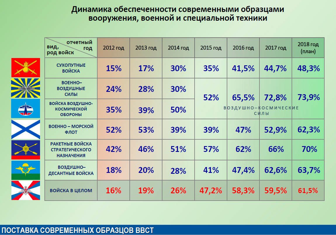 % tiek piekoriģēts pēc vajadzības, līdzīgi kā padomju laikos, lai plāns skaitītos izpildīts. Realitāte ir nedaudz cita. Sākumā (2011.-2012. gadā) plānoja 2300 Armata tankus (uz 2018. gada beigām tanks vēl nav izgājis visus izmēģinājumus, nav uzsākta tā masveida ražošana), 2000 jaunas artilērijas sistēmas – Koalīcija SV un Tornado-S (pirmo tagad sola pabeigt uz 2020. gadu, par otru nesen rakstīja, ka it kā šogad sākti beidzot piegādāt, bet nekas īsti nav skaidrs). Solīja S-500 PGA sistēmas, tās arī ir tālu no pabeigšanas. Solīja 600 jaunas kaujas lidmašīnas. Uzbūvētas ir kādas 200 puslīdz modernas (SU-34 un SU-35), bet 5. paaudzes SU-57 būs smieklīgi mazā sērijā (pašlaik 12). Modernās tehnikas procenti atskaitēs tiek audzēti nevis ar jaunu un modernu sistēmu ražošanu, bet ar veco sistēmu modernizēšanu. Pēc būtības (ja skatāmies sākotnējos plānus) visa bruņošanās programma ir izgāzta, izņemot tikai stratēģiskos raķešspēkus (lai gan tur arī “Sarmatu” solīja daudz agrāk). Investīcijas un ražošanas kapacitāte krieviem pietiek, lai mēģinātu uzturēt 20 gadu atpalicību no ASV (izņemot floti, kur lejupslīde nav apturēta), kas, protams, arī nav maz, ja ņem vērā, ka Krievijas aizsardzības budžets ir, piemēram, mazāks nekā Lielbritānijai, bet karavīru piecas reizes vairāk.