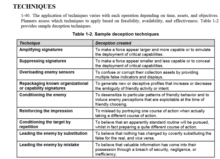vara bungas: Maldināšanas paņēmieni tiek izmantoti ne tikai kaujas laukā, tie noder arī politikā, privātā dzīvē un biznesā 🙂 , tā kā iesaku šo lauka reglamentu lasīt visiem. Metodika ir pietiekami vispārīga un aprakstoša, lai paliktu vieta radošumam, jo principus ne tikai jāzina, bet arī jāizprot, jo tā dara arī maldināšanas objekts – pretinieks.