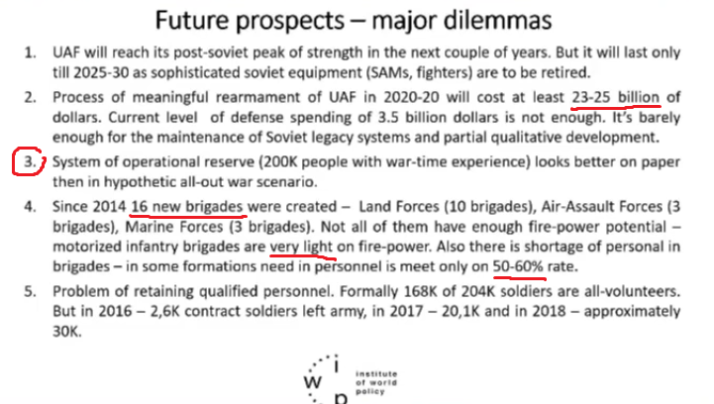 vara bungas: Ļoti informatīva prezentācija no UA pētnieka Mikolas Belieskova par UA armijas attīstību un problēmām, ko kontrastaināku padara atzītā guru – Mihaela Kofmana stāstījums par RU armijas attīstības tendencēm. Mans galvenais secinājums – piecos gados var paspēt sakrāt un sakraut kaudzē “dzelžus” , bet pilnvērtīgas armijas veidošana mērāma augstāko virsnieku paaudzēs. UA, tāpat kā LV, vēl nav tikusi pāri pirmajai. Svarīga robeža, ko paturēt prātā – ap 2028. gadu RU armija sasniegs savu spēju virsotni.