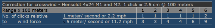 Tabulā redzamais vēja ātrums (m/s} liek saprast, ka snaipera uzdevums jau pie relatīvi lēna sānvēja (pēc Boforta skalas), piemēram 5 m/s, būs stipri apgrūtināts. Pieprasiet no S-2 laika prognozi un zināsiet, kad no snaipera nav jābaidās 🙂