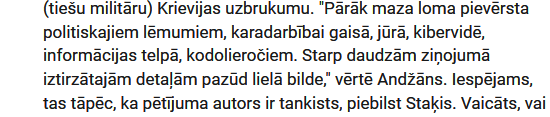 “[..] Parlamentārais sekretārs gan atbild retoriski: “Cik daudzi no mums savus bērnus būtu gatavi sūtīt divus gadus armijā, izņemt viņus no ārā no ekonomikas pie tā darba roku trūkuma, kāds tas ir? Cik daudz cilvēku aizbrauktu no Latvijas[..]”