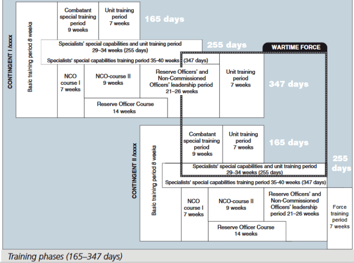 VB: vēršu uzmanību, ka iesaukumi (contingent I , II) kļūst par pilnvērtīgu wartime force, regulārās armijas elementu , kad I iesaukuma instruktori pabeidz speciālo un kolektīvo apmācību, bet II iesaukuma kareivji un instruktori pabeidz pamatapmācību un iesāk specializāciju. LV nav pat ar ko salīdzināt, visi vienādi kaujasspējīgi no zvēresta dienas.