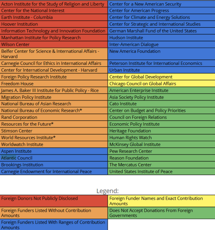 Tēma ir pietiekami sensitīva tādēļ ne visas domnīcas ir ar mieru atkļat ziedotājus. Tabulā zemāk sarkanajā un oranžajā blokā norādītas domnīcas, kuru ārzemju finansēšanas avoti un apjoms nav visai skaidri (tostarp RAND). Tā kā visamz ar sarkanās zonas avotiem jābūt īpaši uzmanīgiem.