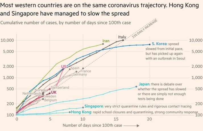 vara bungas:  Izskatās EE atkal mūs apsteidza un pirmā sasniegs 100  COVID-2019 gadījumu skaitu. Uz sestdienas  rītu LV bija 26 gadījumi. Atpalikt šoreiz  ir burtiski veselīgi, jo mums paliek vairāk laika gatavoties.   Sākot ar pirmo simtnieku situācija visticamāk attīstīsies līdz ar vienu no grafikā redzamajām līknēm, tas ir “ap 30% pieaugums katru nākamo dienu” tātad no 100 līdz 200 tikai 5 dienās.  Optimisti var uzskatīt, ka dzīvosim kā Singapūrā, pesimisti, ka nosprāgsim kā Irānā, bet īstenība būs kaut kur pa vidu, atkarībā no valdības pūliņiem un sabiedrības pašdisciplīnas. Pie reizes p“arbaudīsim valdības statistiku, kopš 100. pacienta izplatība nevarētu būt ievērojami zemāka kā citās salīdzināmās valstīs, vai arī būsim  atklājuši kādu latvian know-how par ko pienākas Nobeļa prēmija.