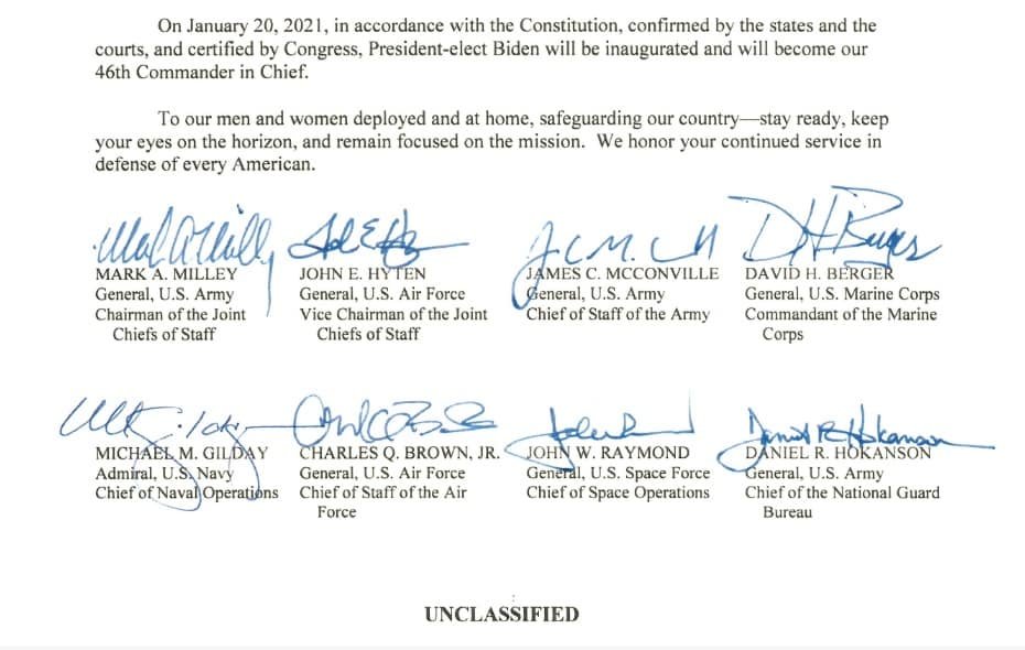 “Efforts to involve the US armed forces in resolving election disputes would take us into dangerous, unlawful and unconstitutional territory. Civilian and military officials who direct or carry out such measures would be accountable, including potentially facing criminal penalties, for the grave consequences of their actions on our republic.”