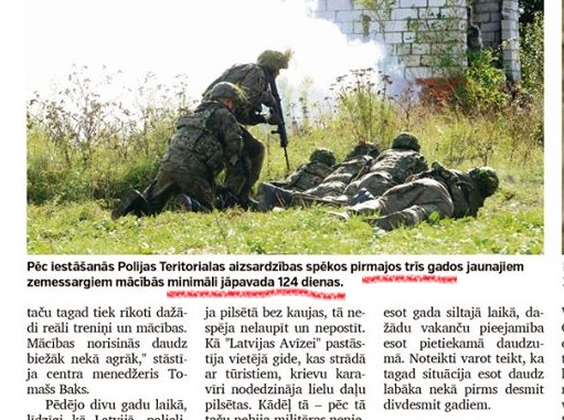 vara bungas: Var uzskatīt, ka 4 mēnešu (3×40 dienas gadā) ievadkurss PL zemessargiem bez priekšzināšanām ir latiņa uz kuras fona mūsu “+-20 dienas pamatapmācībai un gatavs“, demonstrē latviešu iedzimto talantu uz kara mākslām. Bet es tā nedomāju. Vienkārši poļu kaujas virsnieki nezina, ka arī tā var. Ja nopietni, 180 dienas klātienē kājnieku kareivja individuālai un kolektīvai apmācībai ir skaitlis uz ko var droši orientēties. PL nav OMD, bet ir 110 000+ liela regulārā armija un tagad arī 30 000 liela zemessardze (teritoriālās aizsardzības spēki).