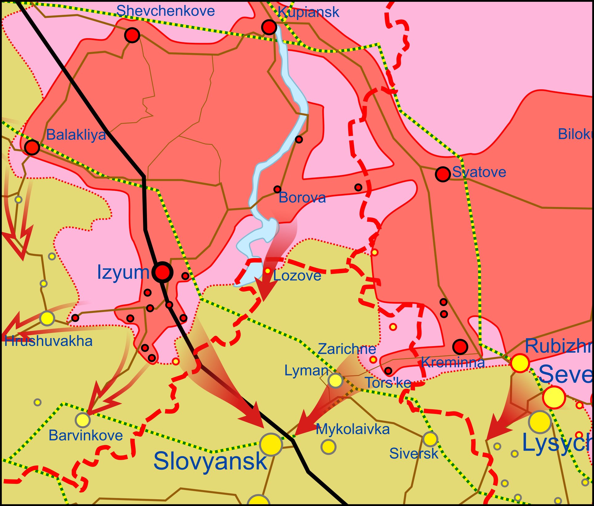 2. otrais ru uzbrukuma vilnis UA austrumos nevar īsti ieskrieties, jo viņi paši var nokļūt katlā. Ukraiņu Harkivas grupējums ir ļoti spēcīgs, kas dod iespēju aši ieskrieties līdz Kupjanskai. tad ru pusei arī apgāde pa dzelzceļu apstājas un Izjumai aizmugurei vairs nav droša. finālā tā fronte būs tik izplūdusi, ka atsevišķas vienības rotu/bataljonu lielumā “peldēs” kkur apvidū, jo teritorija ir pārāk liela tik mazam cilvēku skaitam, lai noturētu drošu fronti. Slavjanska un Kramatorska vien prasīs mega pretinieka spēku piesaisti…