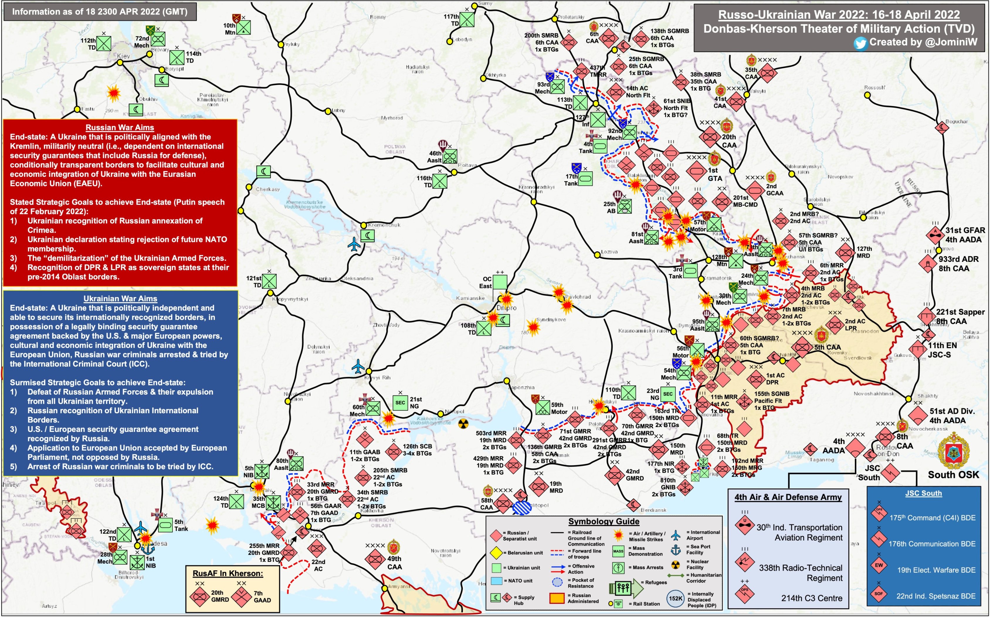 1. Šajā kartē (autors @JominiW) apšaudes piktogammas imbolizē vietas, kur RU tausta UA aizsardzību un kur donājams atrodas UA korpusa līmeņa apgādes centri.