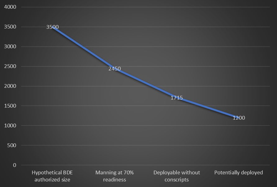 var bungas: Maikla Kofmana grafiks, kas ilustrē personāla iztrūkumu “iedomātā” RU meh.kājnieku brigādē. Tomēr. No vienas puses 70% komplektācija ar personālu miera laikā ir diezgan augsta latiņa ne-elitārajās vienībās, no otras puses OMD elements tiek sūtīts karot UA. Pēdējais krituma posms vispār nav skaidrs, pieņemsim, ka tie tie, kas paliek pastāvīgās dislokācijas vietā. Jebkurā gadījumā skaista ilustrācija tam, ka “brigāde”, “bataljons” vai “rota” ne vienmēr nekad nav tas, ko mēs iedomājamies vadoties no apstiprinātajām ekipējuma un bruņojuma tabulām.