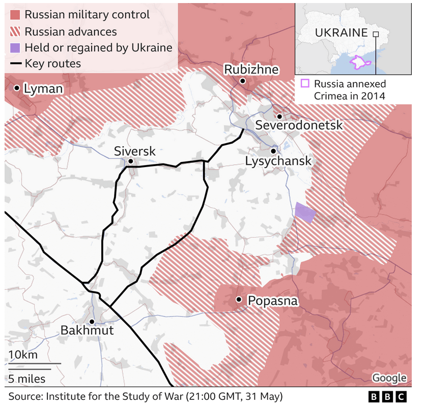 Severodonecka ir pēdējais neokupētais Luhanskas apgabala rajona centrs. Ar tā ieņemšanu RU var uzskatīt, ka nu LNR ir atbrīvota, atliek atbrīvot DNR un specoperācijas mērķis būs sasniegts. Hersonas, Melitopiles un Mariupoles rajoni vispirms ispējams tiks pievienoti DNR. UA savukārt interesē vismaz 23.februāra stāvoklis, tā kā ar Severodonecku būs par maz.