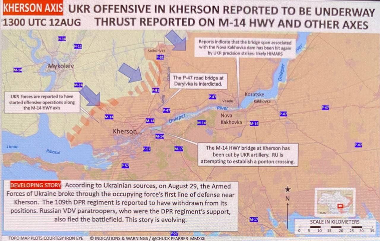Tagad par to, kas IR noticis – Lai pārvarētu pretinieku pozīcijas 10 km dziļumā RU šajā karā patērē 2-3 mēnešus, līdz ar to UA virzīšanās panākumi 24 stundās, kas mērāmi kilometros ir liels sasniegums. UA karaspēku klātbūtni ziņo (dienvidos) no Tomina Balka (19 km līdz Hersonai) un (ziemeļos) no Suhij Stavok (45 km līdz Nova Kahovkai). Attiecīgi secināms, ka UA cenšās “ierāmēt”petinieku un iziet uz pozīcijām no kurām būs nodrošināta Dņepras tiltu iznīcināšana ar haubiču artilērijas uguni (nevis tikai bojāšana ar MLRS). Tominas Balkas ieņemšana to nodrošinātu attiecībā uz Antonovskij tiltu.
