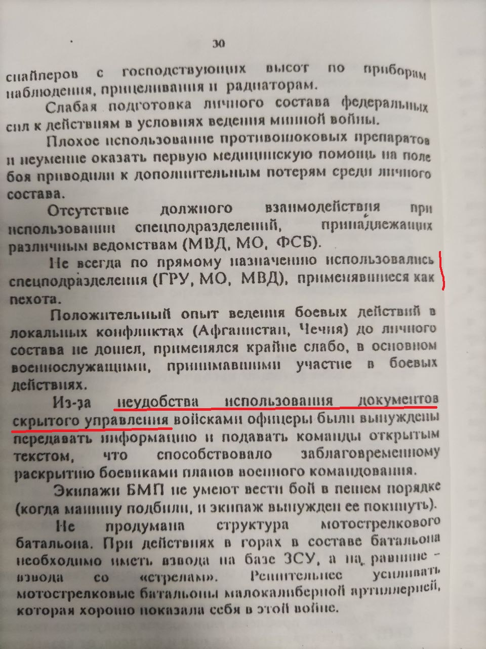 vara bungas: Izvilkums no 23 gadus vecas brošūras, kas bija veltīta RU karaspēka taktikas analīzei pēc 2. Ičkērijas kara. Kaut kas palika nemainīgs – uzsvars uz bruņutehnikas daudzumu un artilērijas pārākumu, kaut kas netika ņemts vērā – “trijnieku” taktika (strēlnieks, snaiperis, granātmetējs). Kaut kas transformējās par čmobiku izmantošanu – viltus uzbrukumi -“razvedka bojem”.
