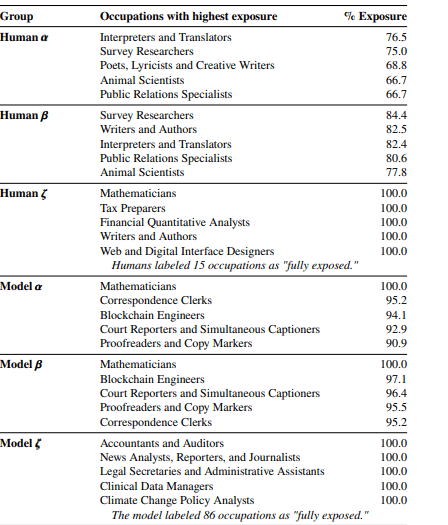 VB: tas ir, profesijas, kas vismazāk pakļautas LLM ietekmei prasa visvairāk apmācības darba vietā (nav nepieciešams grāds), bet nodrošina zemāku atdevi (ienākumu ziņā), kad tiek sasniegta nepieciešamā kompetence. Pretēji tam, profesijas, kurās nav nepieciešama apmācība darba vietā vai nepieciešama tikai prakse (bakalauri, maģistri), nodrošina augstākus ienākumus, bet tās ir vairāk pakļautas LLM tehnoloģiju ietekmei.