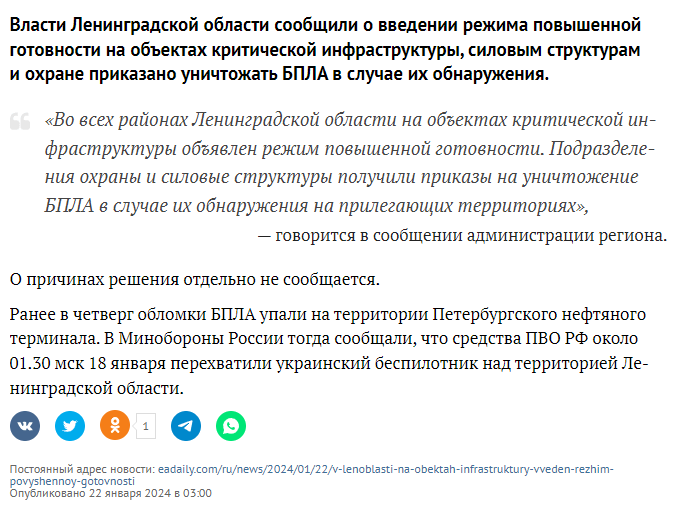 vara bungas: Leņingradas un Pleskavas apgabālā notiek interesantas kustības: laikā no 25.-30.janvārim nakts stundās tiks atslēgti LTE (4G) mobilie sakari VISIEM lietotājiem. Oficiāls skaidrojums-tehniskie darbi. Neoficiālā versija paģer, ka tas tiek darīts tādēļ, ka UA tālās darbības droni, kas apdraud RU naftas/gāzes pārstrādes un eksporta infrastruktūru navigācijai izmanto RU mobilo operatoru sakaru tīklus.