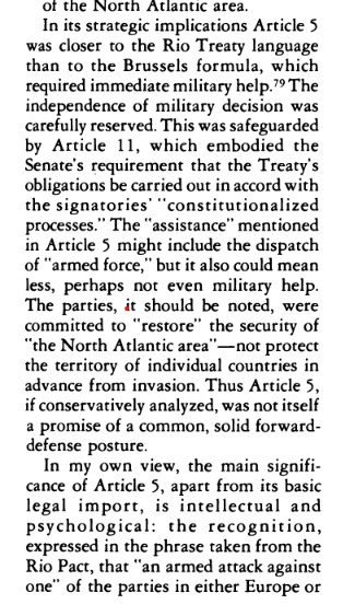 vara bungas: 1980.gada zinātnisks raksts par Ziemeļatlantijas (NATO) līguma tapšanas vēsturi 1948.-1949.gadā. Pētījums vecs kā pasaule, tādēļ brīvs no mūsdienu aizspriedumiem un politiskā korektuma, tolaik autoram nevajadzēja paturēt prātā , ka kāds var apvainoties vai kaut ko pārprast. Lai nebūtu domstarpību: 5. panta gramatiskā interpretācija principā nevar dot atbildi “Jā” vai “Nē”, jo 5.pants ir apzināti juridiski konstruēts tā, lai lielvalstīm vienmēr būtu manevra iespēja. Tātad praksē X stundā visu noteiks tā brīža politisko zvaigznāju kombinācijas. Šobrīd tās ir mums labvēlīgas, rīt…