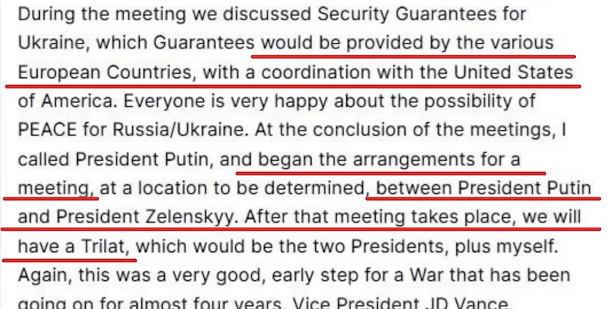 Kamēr UA domās un ja nepiekritīs šim “dzelzsbetona grābeklim” Ze-Pu tikšanās nenotiks. Vainīga par kara turpināšanos tad būs UA, Tramps mazgās rokas nevainībā (noleks no tēmas) un turpmāk ar 10% uzcenojumu pārdos lohiem-eiropiešiem ieročus, kurus tie dāvinās UA. US izlūkošanas informācija un Starlink nonāks zem ļoti lielas jautājuma zīmes. Tas, lai ukraiņiem raitāk domas sakārtojas.