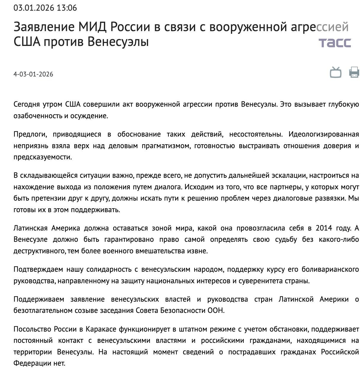 Tramps izteicās, ka Maduro apsardze bijusi no kubiešiem, kuri cietuši. Venecuēlas Augstākā tiesa nesen atzina Rodrigesu par prezidenta p.i.. Pati Rodigesa jau izrunājās pret ASV – cīnīsies, naftu neatdos, bet Maduro turpina būt prezidents. Arī čavistu vairākums Venecuēlas parlamentā un Maduro ielikteņi armijā, specdienestus un visur citur nekur nav pazuduši. Izskatās, ka Tramps Venecuēlas naftas pārņemšanu nav līdz galam pārdomājis. Ar to būs problēmas.