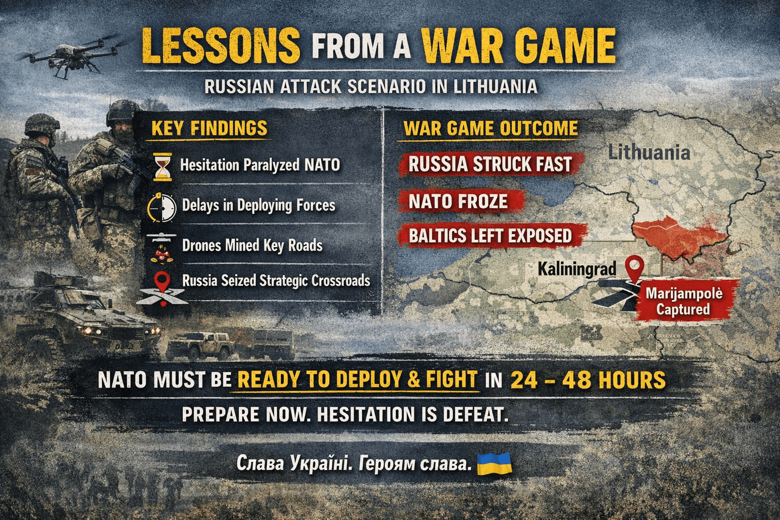 [..] In the exercise, Russia used the pretext of a humanitarian crisis in the Russian exclave of Kaliningrad to seize the Lithuanian city of Marijampole, a key crossroads in the narrow gap between Russia and Belarus. Russian portrayals of the invasion as a humanitarian mission were sufficient for the U.S. to decline invoking NATO’s Article 5 that calls for allied assistance. Germany proved indecisive, and Poland, while mobilizing, didn’t send troops across the border into Lithuania. The German brigade already deployed to Lithuania failed to intervene, in part because Russia used drones to lay mines on roads leading out of its base. [..]