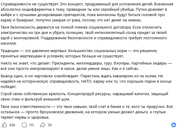 1. Izskatās pēc “nau vērc” jeb “kāpēc man jāmaksā nodokļi?” manifesta. Pēc uzvārda spriežot, autors varētu būt ukrainis – sēžot 4 gadus zem droniem vājuma un pesimisma brīži ir vairāk ka saprotami. Tomēr kopumā cilvēce “uz zemes nav taisnības, dūrei tik spēks” ideoloģiju ir pārbaudījusi tūkstošiem gadu ilgi, un kaut kā tomēr dzīvot civilizācijā ir daudz patīkamāk. Protams, plānam B – ja civilizētas savstarpējās attiecības nobrūk – ir jābūt, taču, ja katrs sāks rūpēties tikai par savu bankas kontu un ģimeni, kā autors, šķiet, iesaka, tas haosa iestāšanos tikai paātrinās.